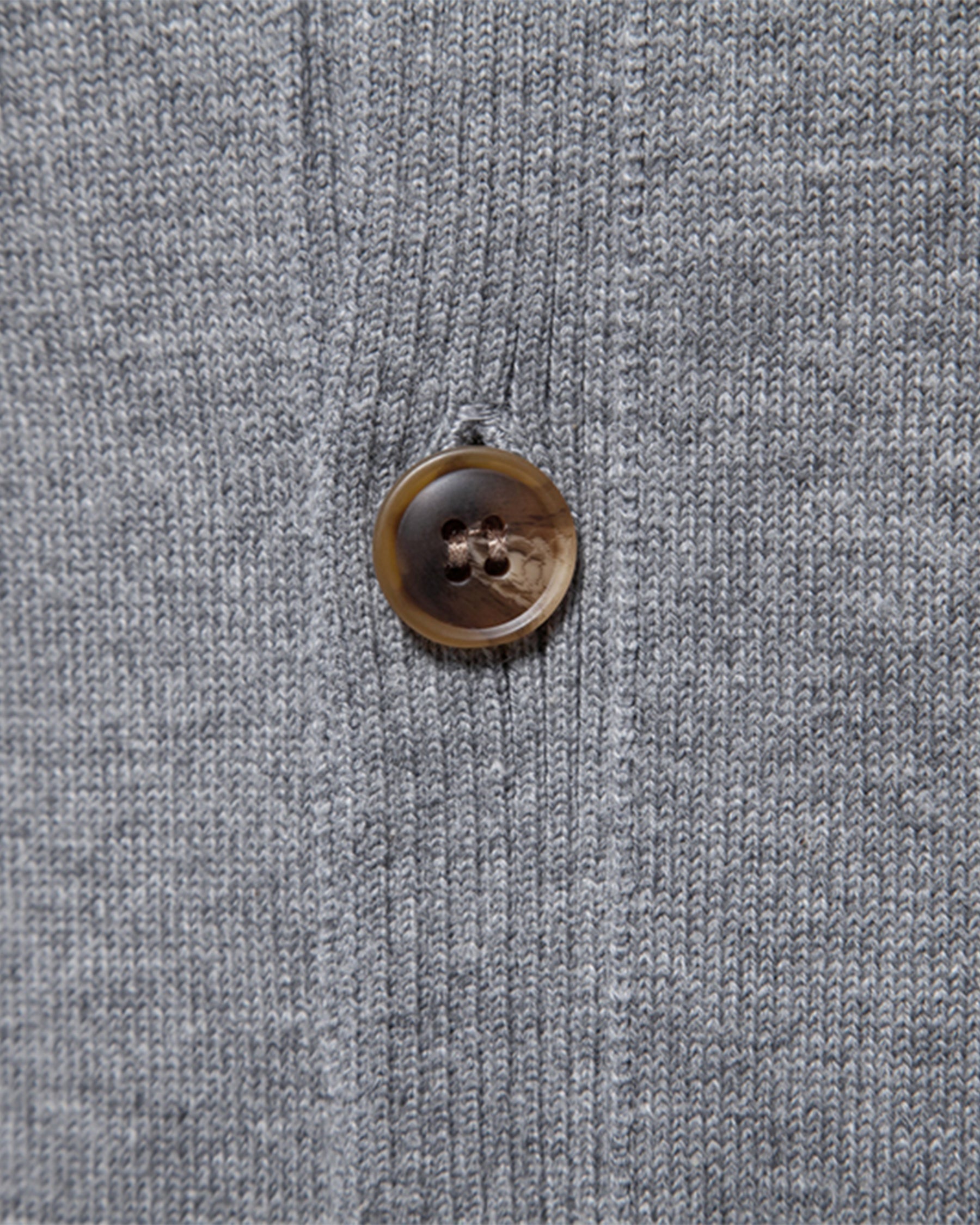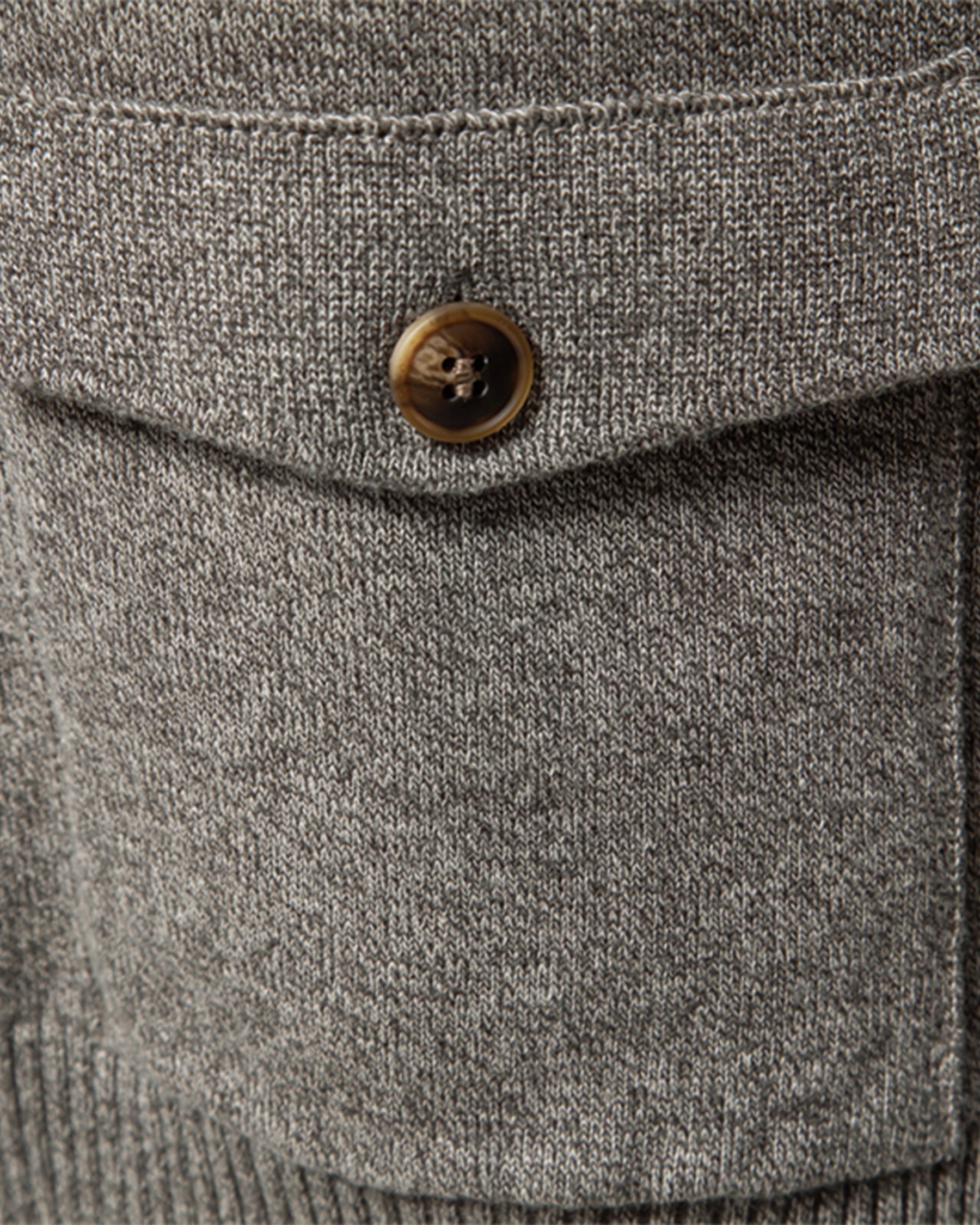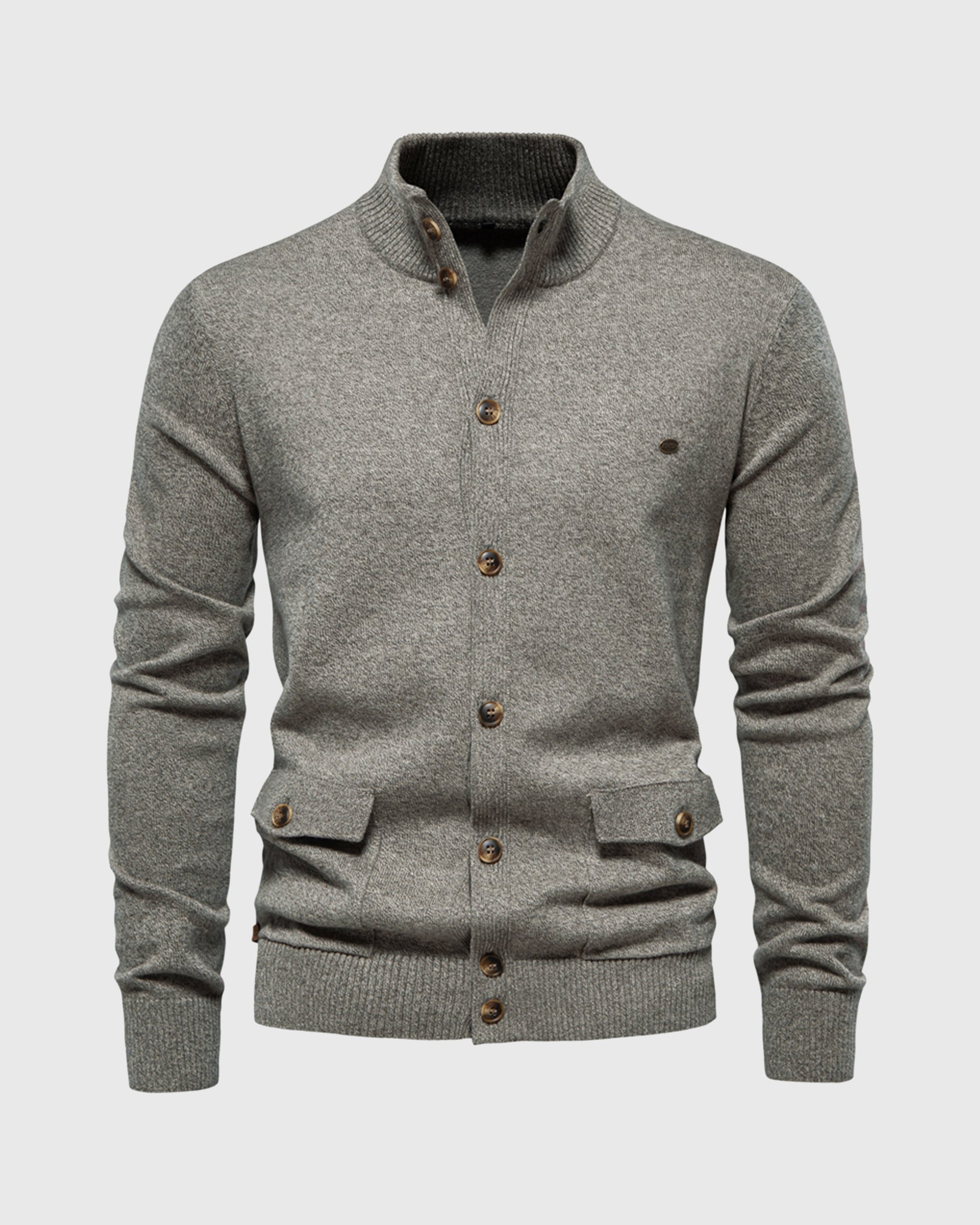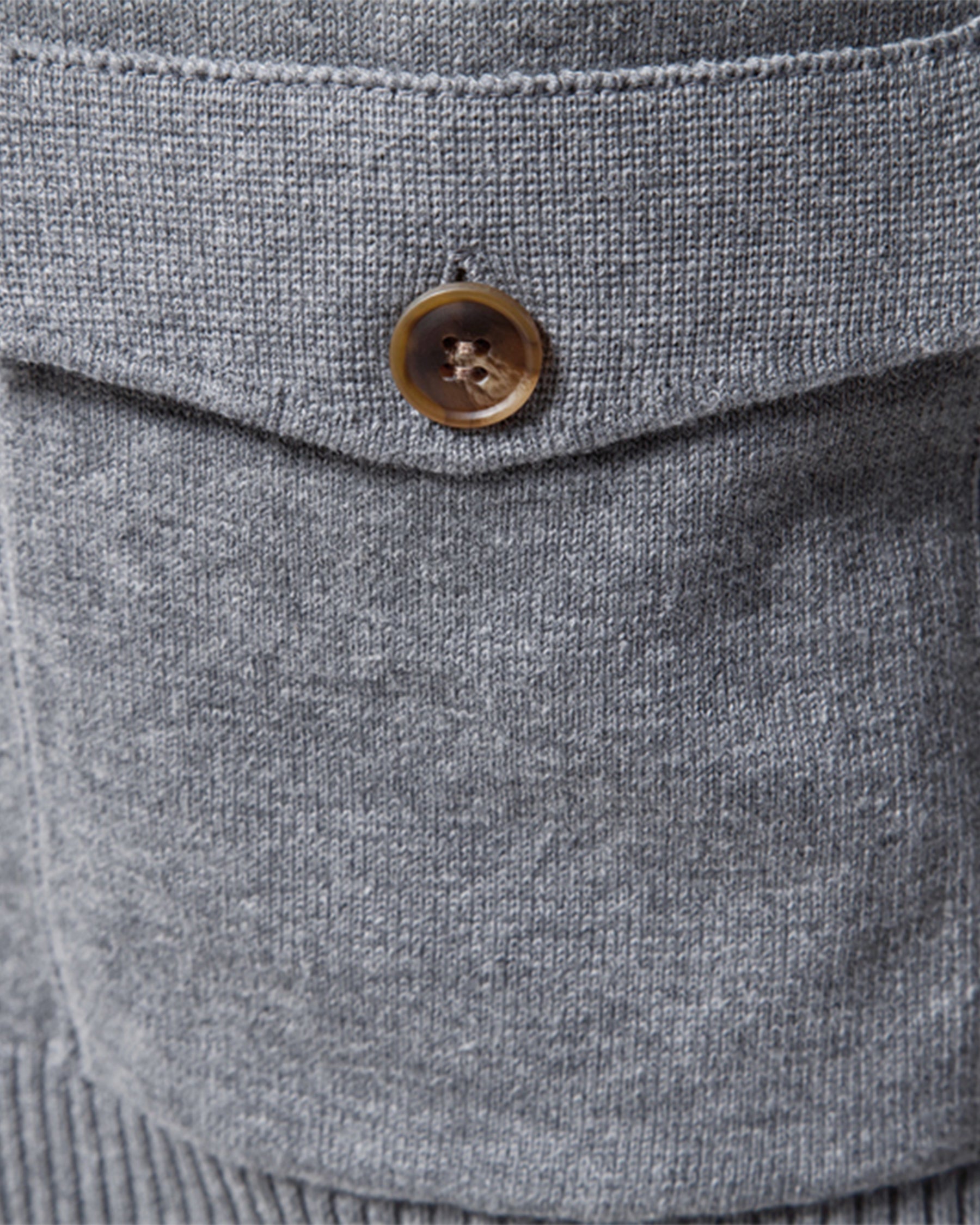 Esta chaqueta de punto gris claro para hombres combina estilo y funcionalidad. Cuenta con un cuello alto, una franja de botones y dos bolsillos inferiores. Con su ajuste ceñido y sutil logotipo de la marca, es versátil para ocasiones informales y semi-formales.