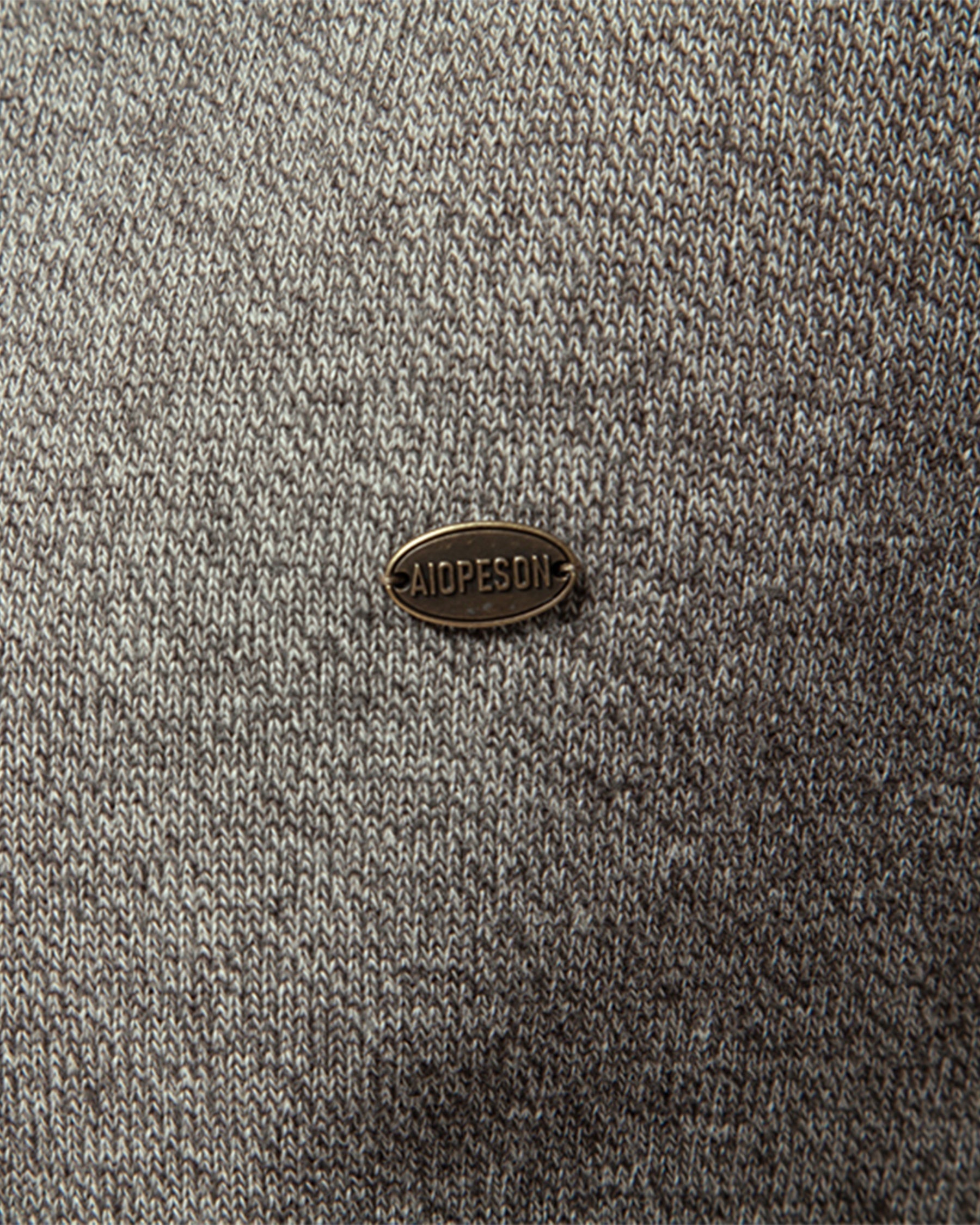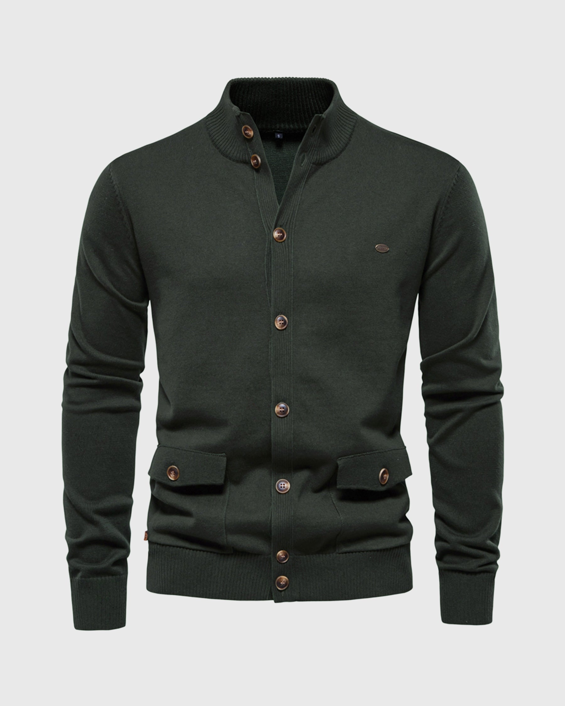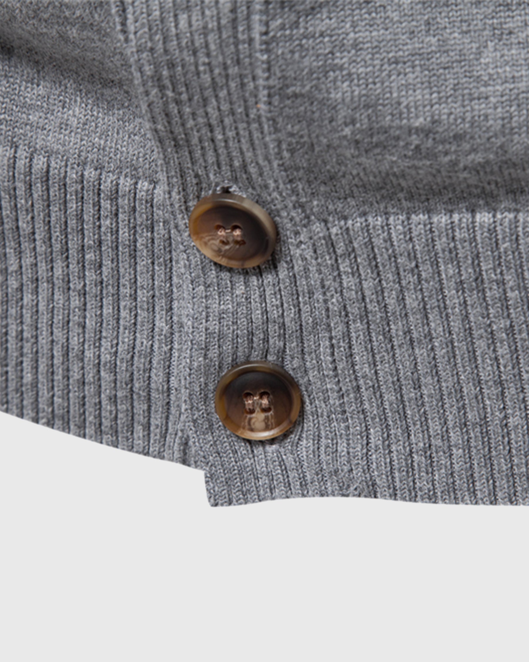 Esta chaqueta de punto gris claro para hombres combina estilo y funcionalidad. Cuenta con un cuello alto, una franja de botones y dos bolsillos inferiores. Con su ajuste ceñido y sutil logotipo de la marca, es versátil para ocasiones informales y semi-formales.