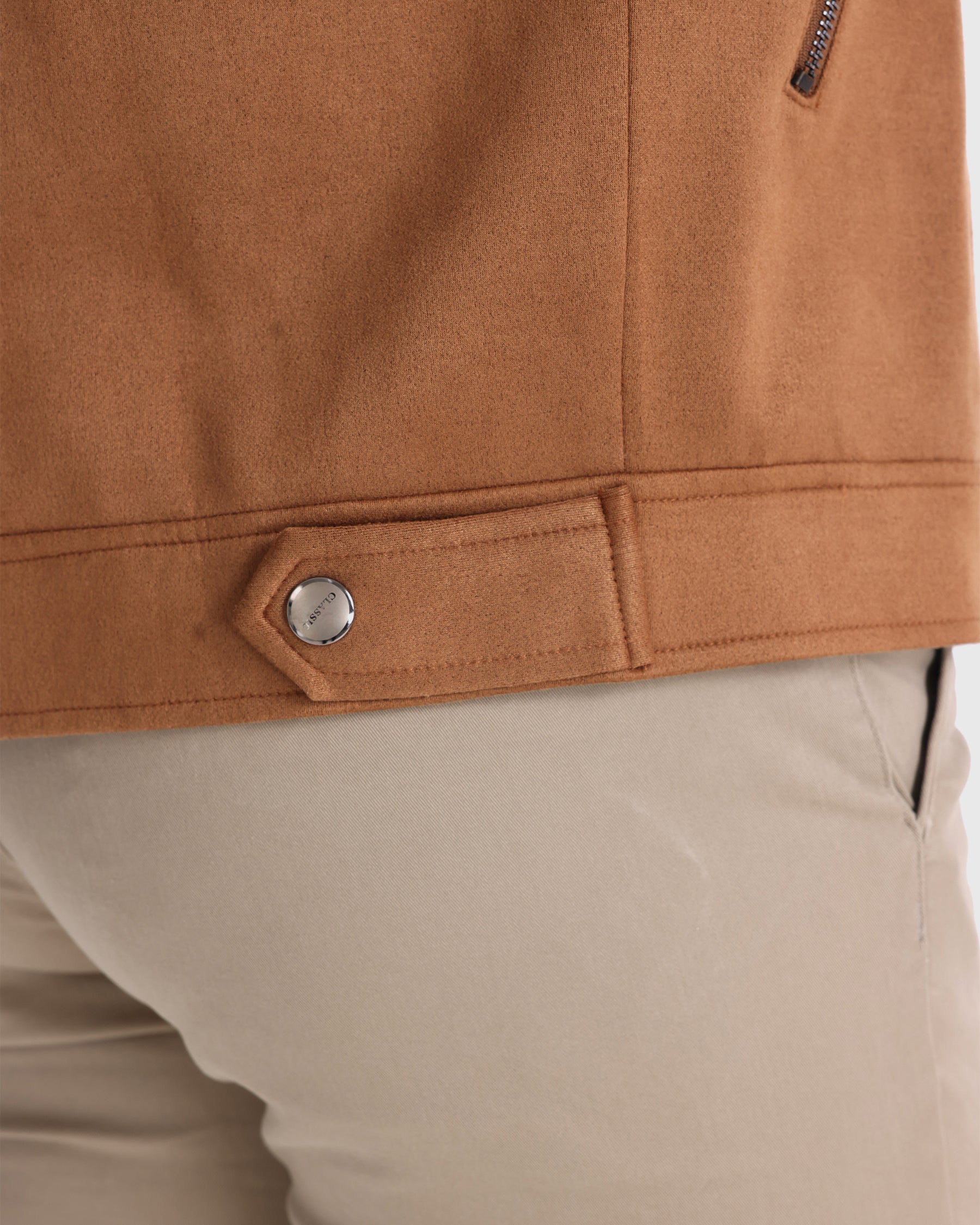 Ideal para hombres con conciencia de moda que valoran el estilo y la funcionalidad, esta bomber de ante en color camello es una necesidad para elevar tu vestimenta cotidiana.