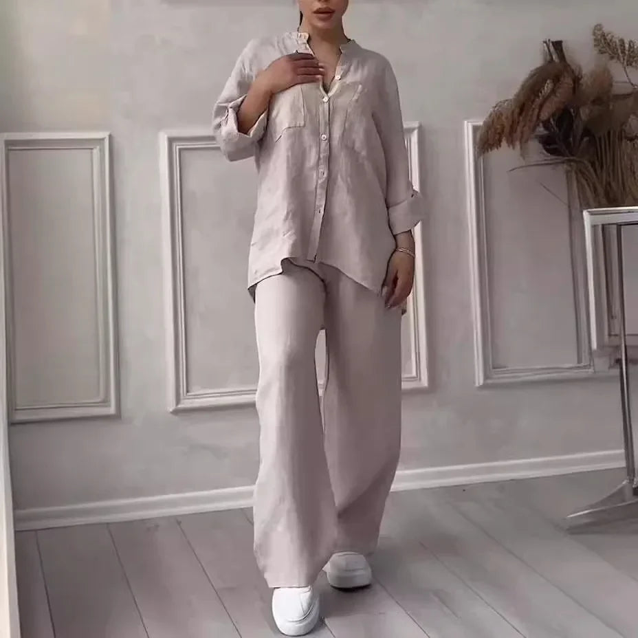 - Prendas informales versátiles:Este conjunto informal de camisa de algodón y lino y pantalón de pernera ancha es perfecto para una gran variedad de ocasiones, desde un día de compras hasta una cena informal.