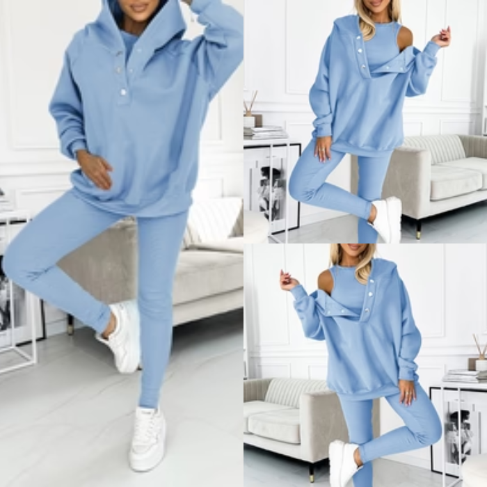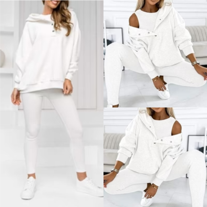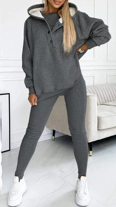 Este conjunto, con su sudadera con capucha y pantalón ajustado, ofrece un ajuste moderno que realza tu figura mientras disfrutas de la máxima comodidad. El corte casual lo hace perfecto tanto para entrenar como para salidas informales.