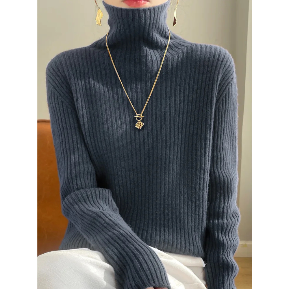 Envuélvete en una sofisticación atemporal con este jersey de cuello alto de cachemir. Con su suave textura acanalada y su ajuste versátil, es imprescindible para lograr elegancia y calidez sencillas.