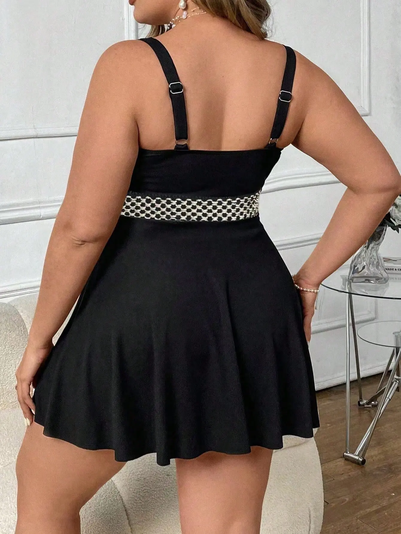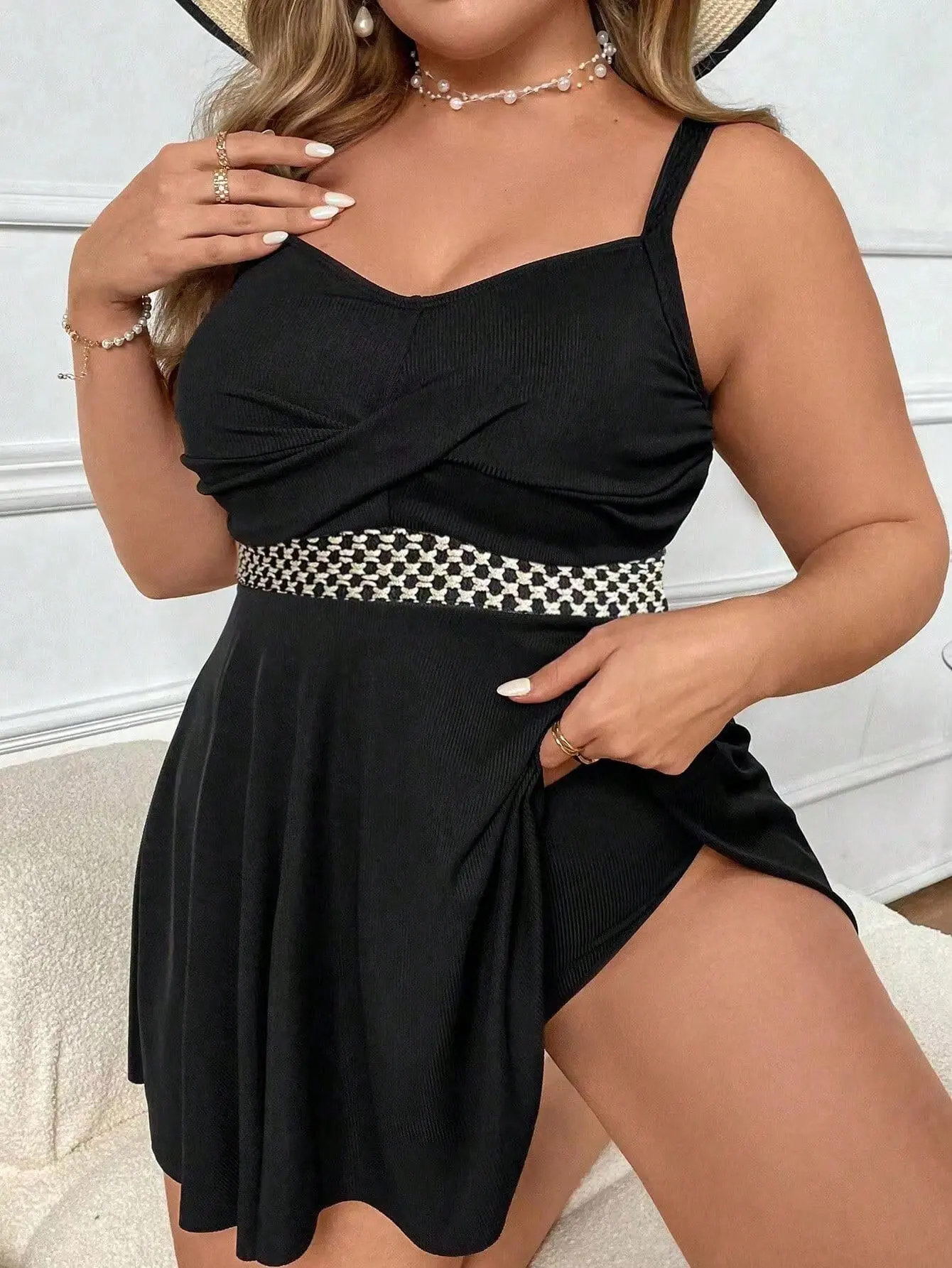 Swimdress plus size (0XL–4XL) en color negro: top con cruce tipo push-up y tirantes para buena sujeción, cinturilla con detalle de malla que define la zona media y faldita con caída para una cobertura elegante. Tejido de secado rápido y alta elasticidad (4-way stretch); el forro suave ayuda a evitar transparencias para un calce cómodo y seguro en playa o piscina.