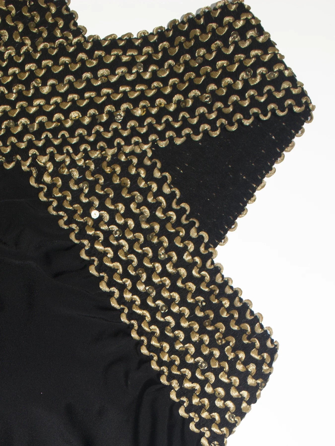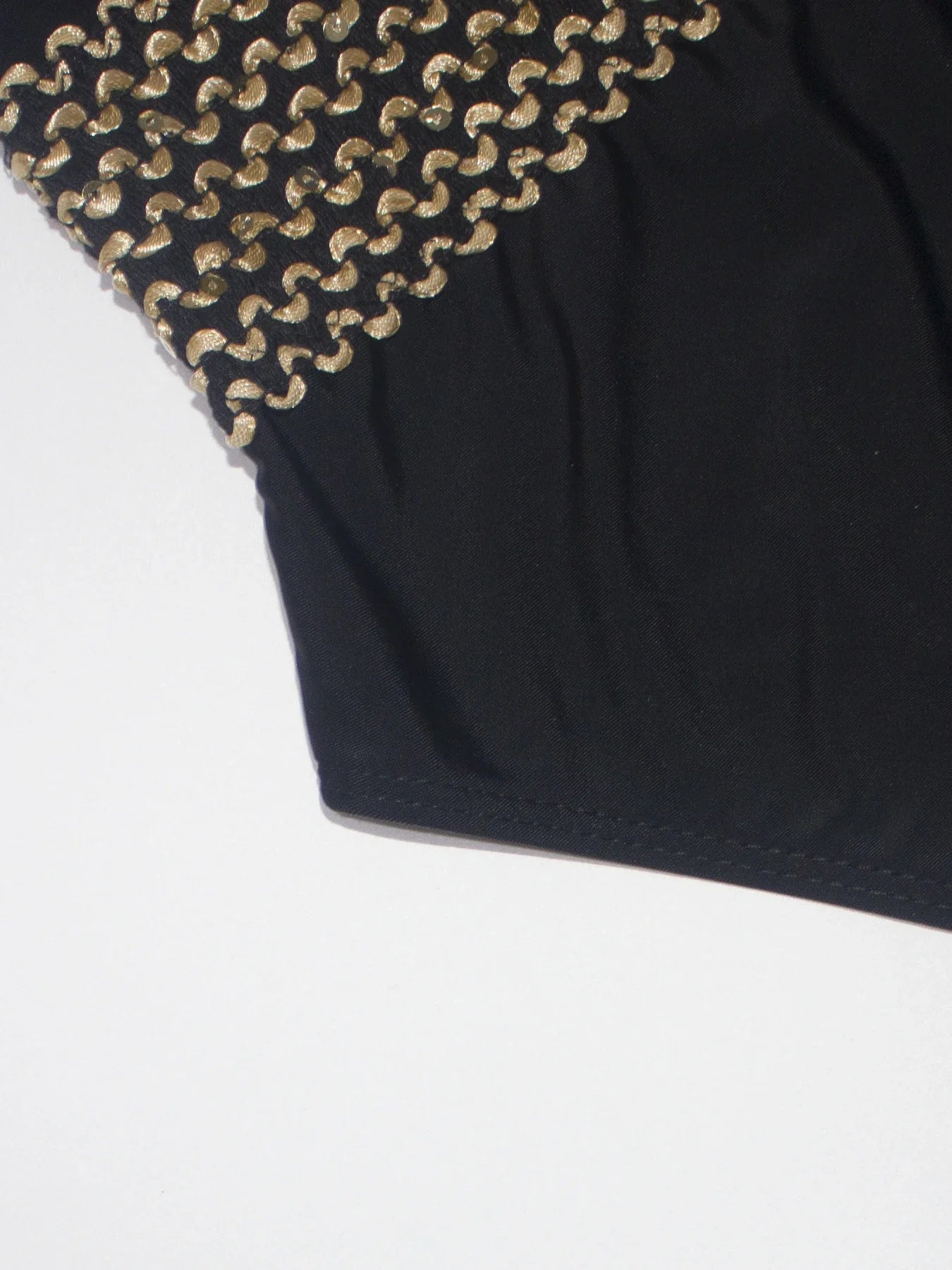 Entero negro con escote tipo bandeau y tirantes cruzados en X que enmarcan hombros y cuello. Confeccionado en tejido de secado rápido y alta elasticidad (4-way stretch); el forro suave ayuda a evitar transparencias y mantiene un calce cómodo y seguro para playa o piscina.